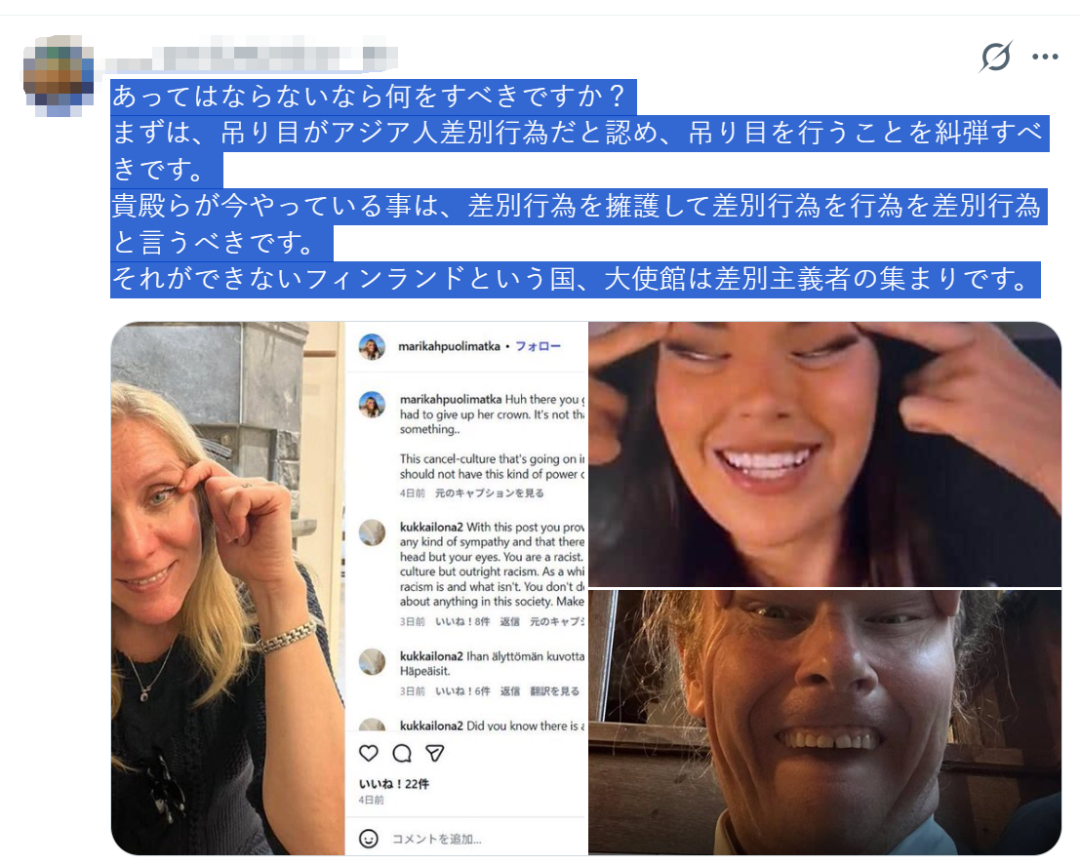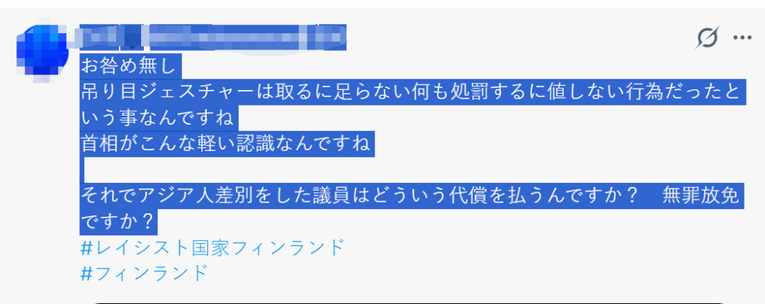 先是芬兰驻日大使馆在社交媒体上发布了一份声明,语气依然诚恳,反复强调平等、包容,以及公众人物应当以身作则,并表示联合执政各党党团代表已经就相关议员的行为展开讨论,并一致予以谴责。但日本网友的反应,却相当不客气。