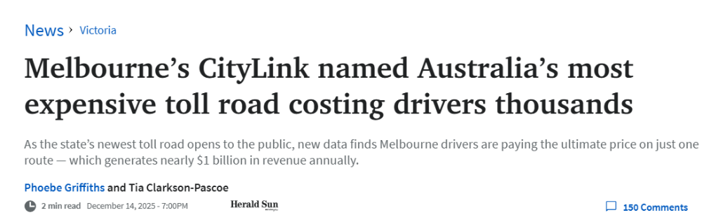 今年8月,澳媒报道称,该公司在过去一年里从墨尔本司机那里赚取了近10亿澳元,使CityLink成为全澳第二赚钱的收费公路。
