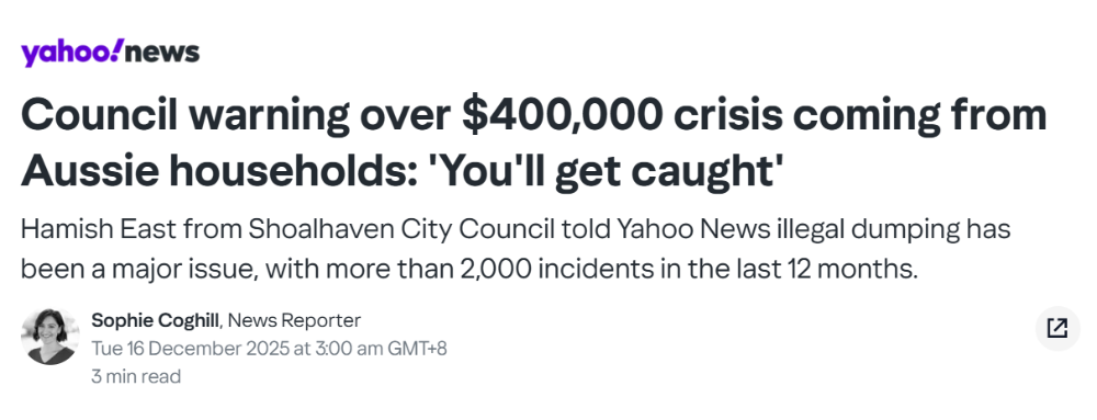 Shoalhaven市议会代表Hamish East表示,当地非法倾倒事件在过去五年内激增了五倍,单是在过去12个月里,就让市议会承担了将近40万澳元的清理费用。
