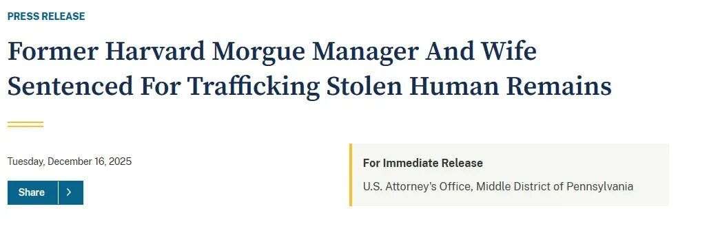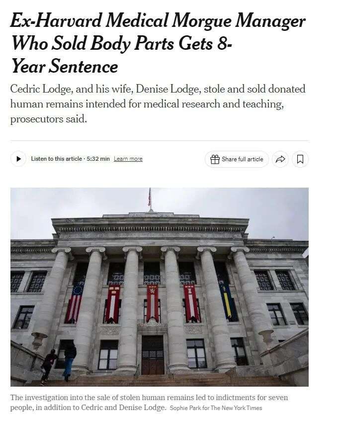 收藏哈佛医学院主管偷卖遗体,把太平间当菜市场带人“进货”?!如今被判8年...