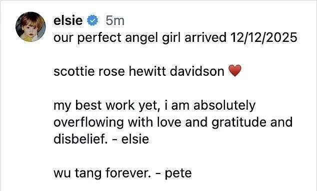 就在昨天,皮特的模特女友艾尔西·休伊特在ins上官宣,他们的女儿已经在12月12日出生,名叫斯科蒂·罗斯·休伊特·戴维森(Scottie Rose Hewitt Davidson)。