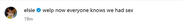 7月份艾尔西在Instagram宣布怀孕,分享了超音波照片和两人依偎的甜照,还直白地配文“哎呀,现在大家都知道我们发生过关系了”。