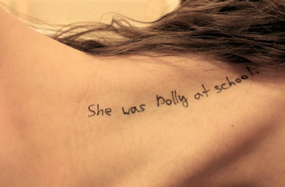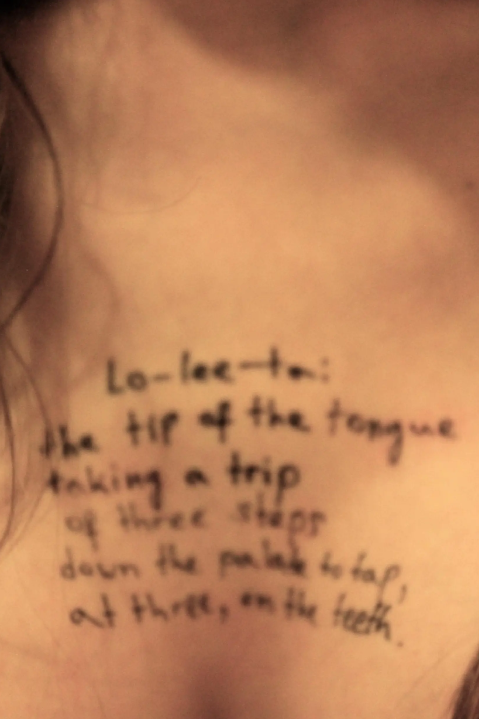 在另外2张照片上,女孩的胸口和肩膀处也被写上《洛丽塔》的对白。