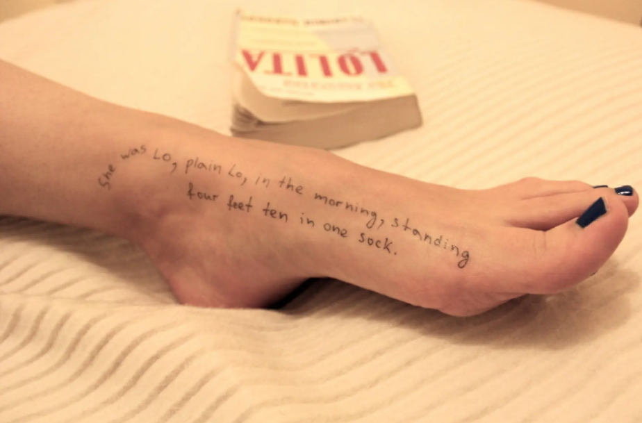 在一组女性受害者的照片上能看到,她们的身体部位被当成信纸。在其中一张照片上,远处有一本《洛丽塔》原著,女孩的脚踝上还写着该小说的对白。