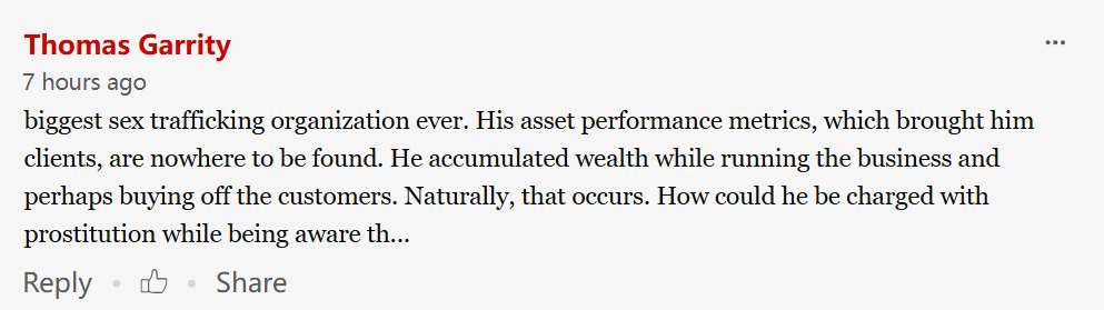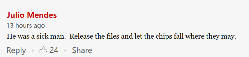 “任何一个经常和这个恶魔有来往的人,都清楚他在干什么,比如盖茨和克林顿,他们俩都应该进监狱。早就该有人把爱泼斯坦这个畜生干掉了。但结果呢?他们都在沉默着配合,因为一些所谓的精英阶层里,有很多是恋童癖。”