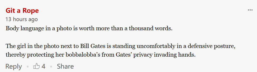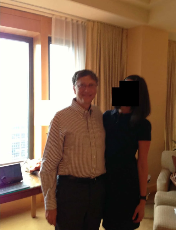 “照片里的肢体语言,胜过千言万语。和比尔・盖茨同框的女孩站得特别局促,明显有防御性的站姿。她就是为了防止比尔·盖茨不干不净的手,一直护着自己的私密部位。”