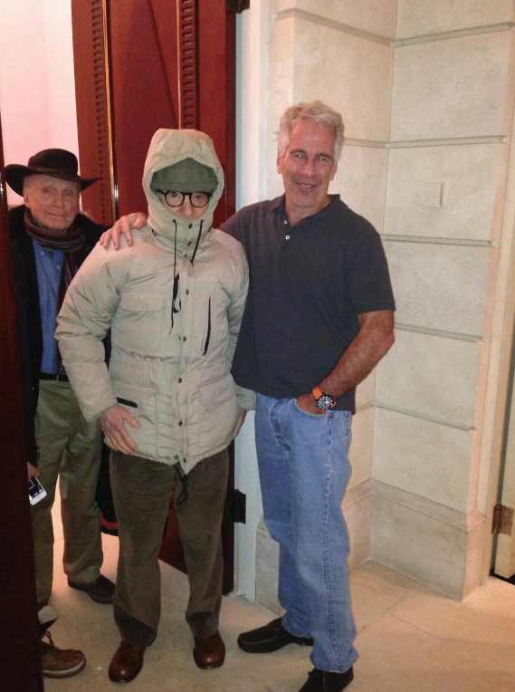 大导演伍迪·艾伦也多次出现在照片中。其中一张,他和爱泼斯坦并肩合影,背景像是酒店大堂。