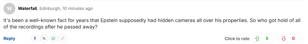 “众所周知,爱泼斯坦在多年前就说自己在房间里安装了摄像头。那他死后,谁拿走了那些录音、视频呢?”
