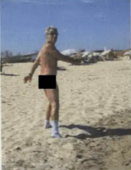 在一堆爱泼斯坦的沙滩照中,他全裸向前奔跑,屁股处被涂黑。