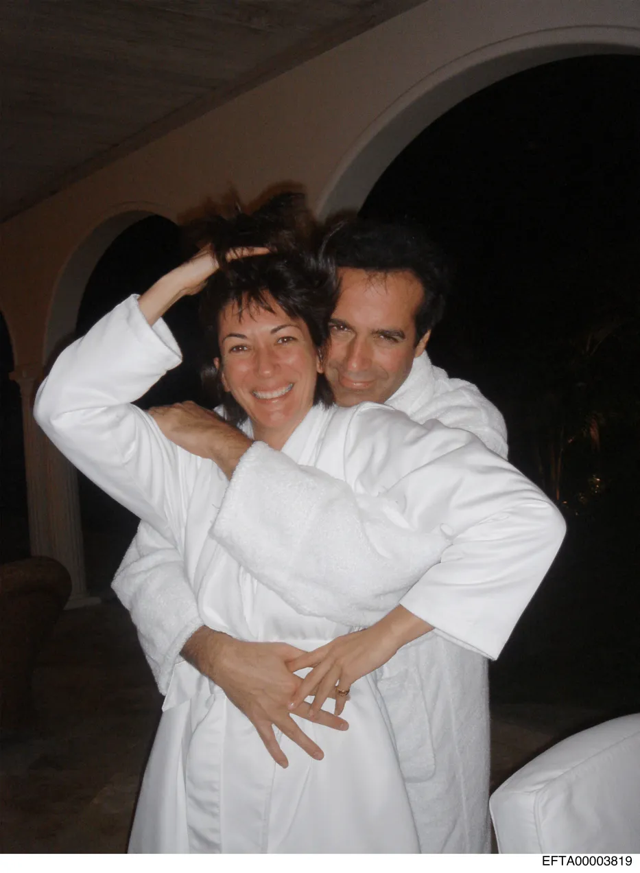 麦克斯维尔和知名魔术师大卫·科波菲尔有多张浴袍照,后者曾被指证在“恶魔岛”的晚宴上为名流权贵们提供表演。
