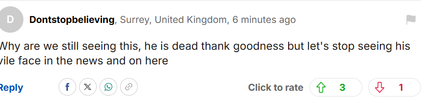 “做错什么了,又要看这些玩意儿。谢天谢地他已经死了,别再让他那恶心巴拉的嘴脸出现在新闻了!”