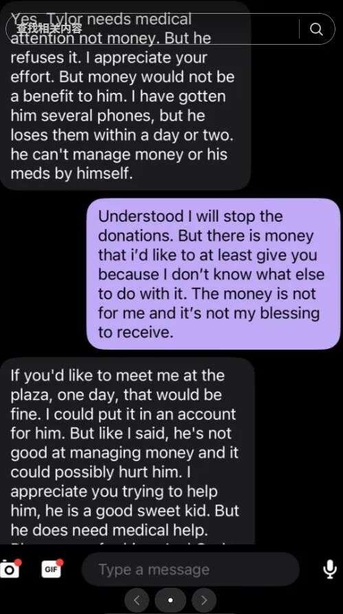Chase的母亲说:“他需要的是医疗救助,不是钱,但他总是拒绝医疗。我很感激你的努力,但钱对他来说没有益处,我给他买过好几个手机,但他一两天之内就会搞丢。他自己根本没法管理买药的钱。”