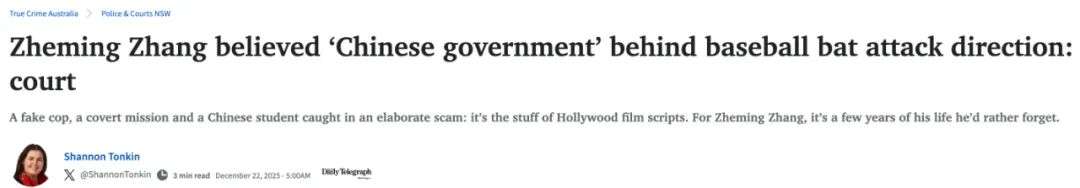 张哲明(Zheming Zhang,音译),向警方供称,自己坚信自己是受命于“上海警方”,出手惩戒的是一名居住在Matraville的澳洲政府职员。