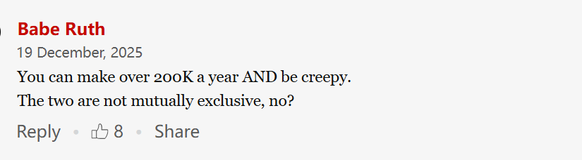 “如果这能让她开心又经济独立,那就祝她事业越来越好。这毕竟是她自己的人生,而且又没伤害到别人。我个人对这些内容不感兴趣,就是有点好奇, 谁会花钱看这种东西呢?”