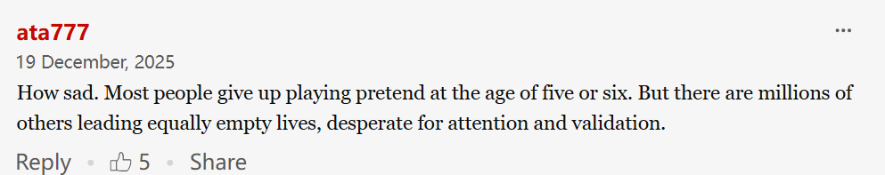 “好可怜,多数人在五六岁时就不玩这种过家家游戏了,没想到数百万精神空虚的人,靠这样博眼球、寻求被关注。”