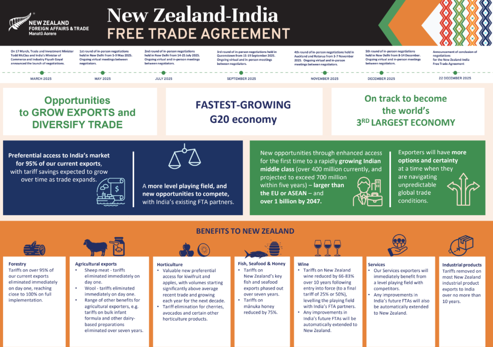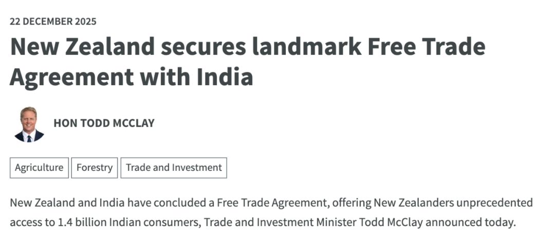 临近圣诞节,新西兰政府昨日公布了一项重磅消息:新西兰与印度正式达成自由贸易协定(FTA),取消或降低新西兰95%的出口商品关税!
