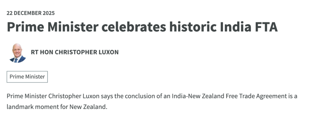 同一天,新西兰总理Christopher Luxon表示,与印度达成自由贸易协定是新西兰的历史性时刻。