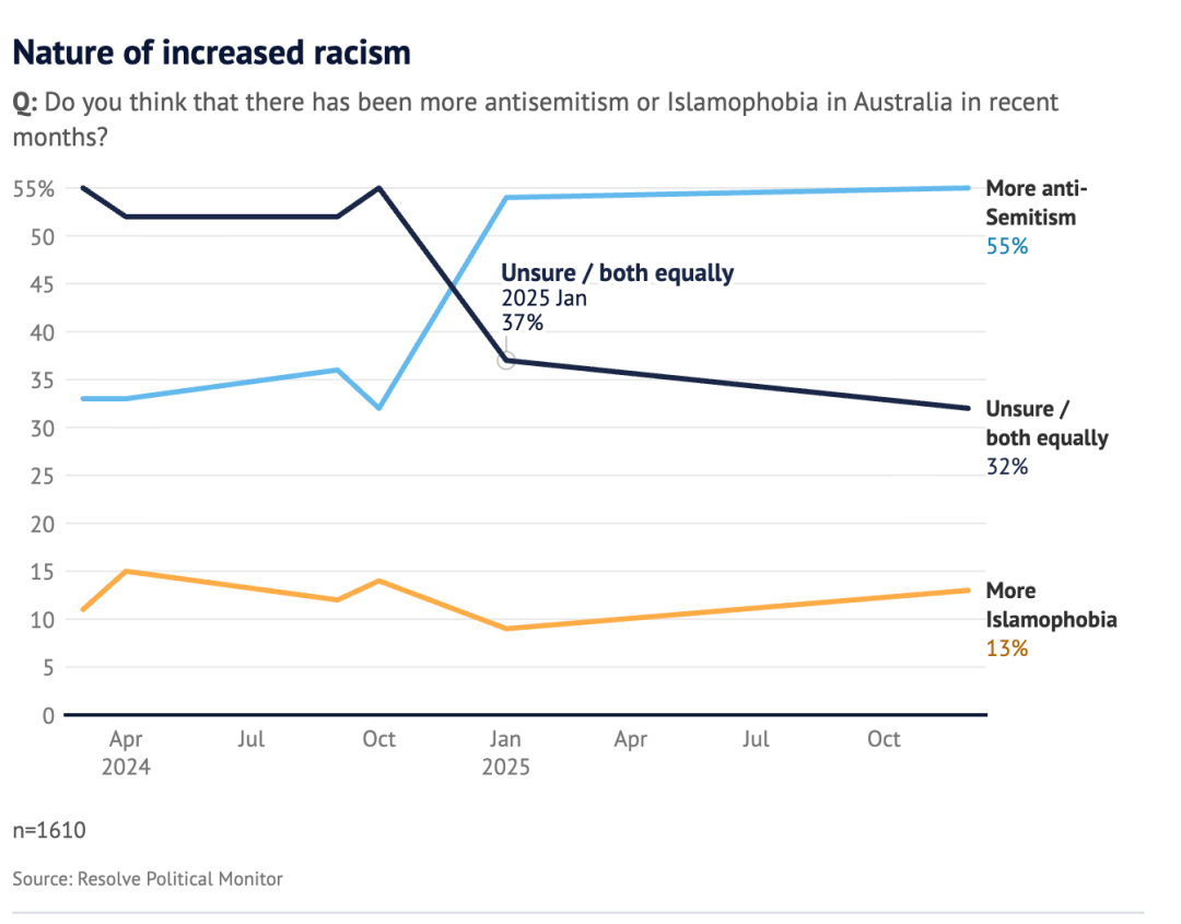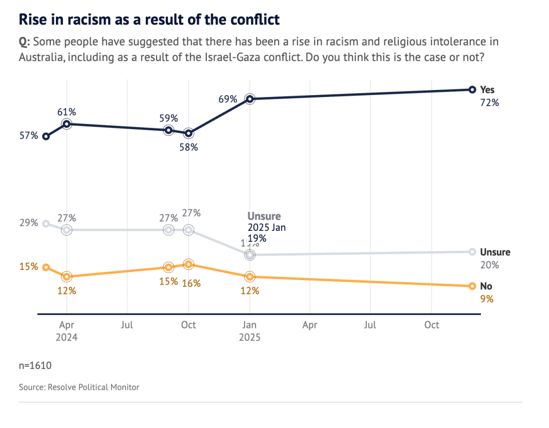民调揭示了一个广泛共识:自2023年10月加沙冲突爆发以来,种族主义和宗教不容忍现象在澳大利亚有所加剧。高达72%的受访者同意这一说法。