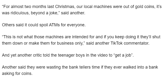 “ 去年圣诞那阵子,我们本地的(ATM)机器硬币空了快2个月,这太离谱了,开什么玩笑。”