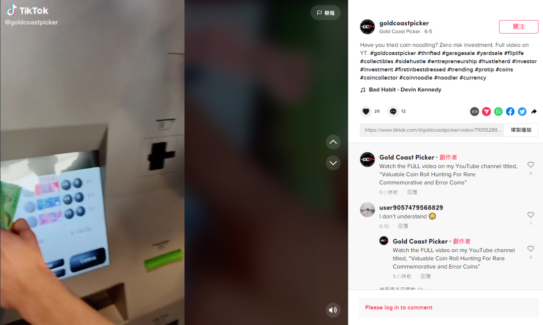 视频的标题是,“你有试过集硬币(coin noodling)吗?零风险投资哦。”