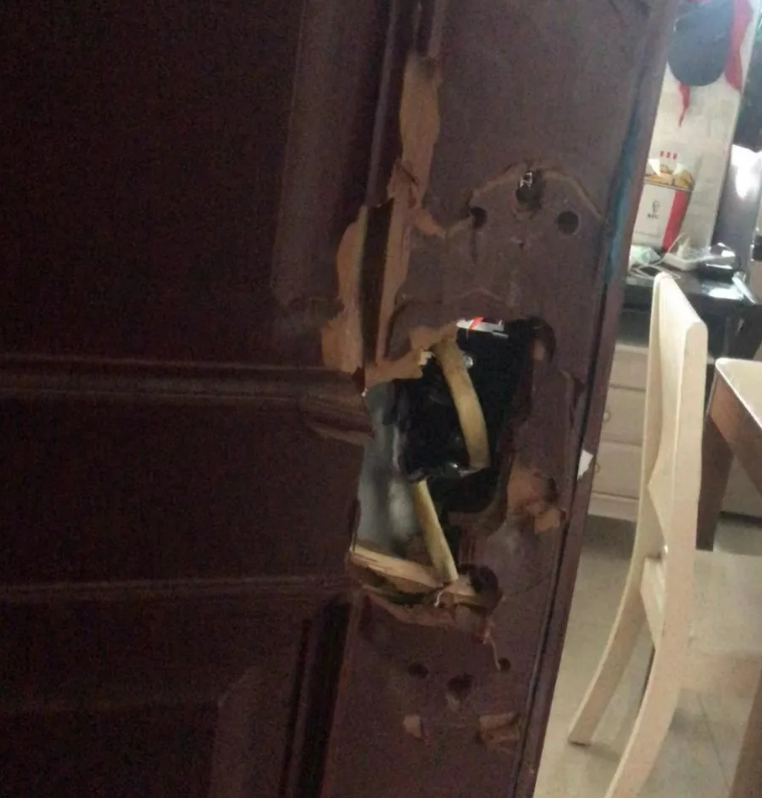 △案发现场,被破坏的门锁。