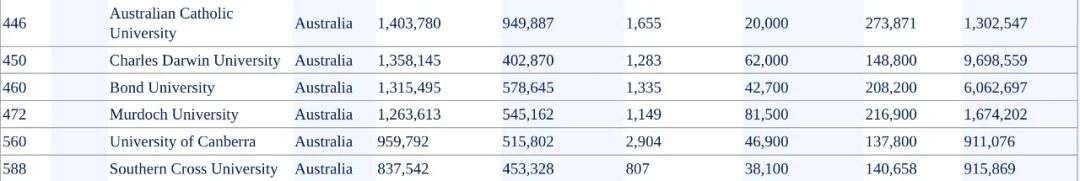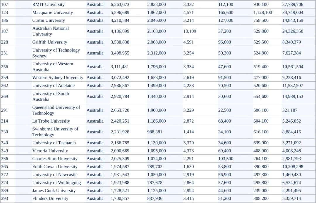 西澳大学和阿德莱德大学这俩八大成员分别排在256和262!