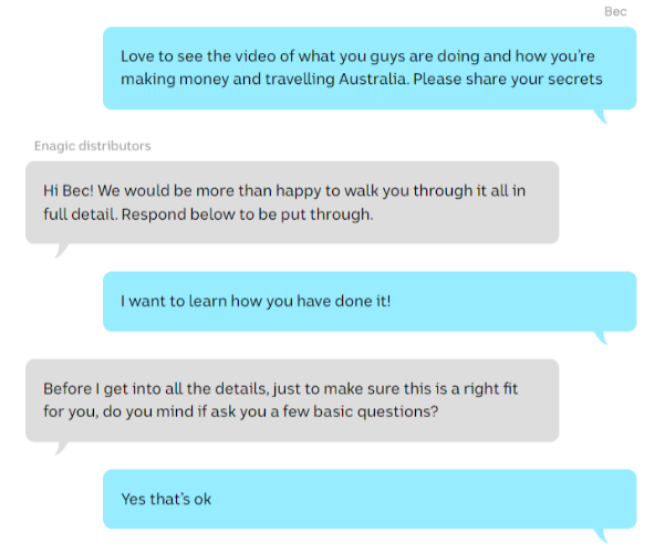 在简短的聊天纪录中可见,对方体贴地关心了Bec的现状和实现财务自由后的梦想——一边开车环澳游,一边在车里卖货。