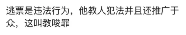 “逃票是违法行为,他教人犯法并且还推广于众,这叫教唆罪。”