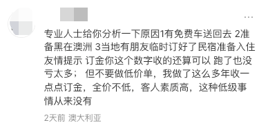 评论区很快炸成一片。做旅游的同行出来分析,说得非常直接:有免费车接走、准备黑在澳洲、或者当地已经有朋友提前订好了民宿。最后那句提醒,让不少同行直接沉默:低价单,真的太容易遇到这种人!