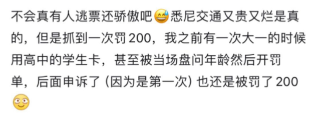 一名网友分享了自己的经历,说自己大一的时候用过学生卡,被当场盘问年龄,直接罚了200澳币,申诉也没能免掉。