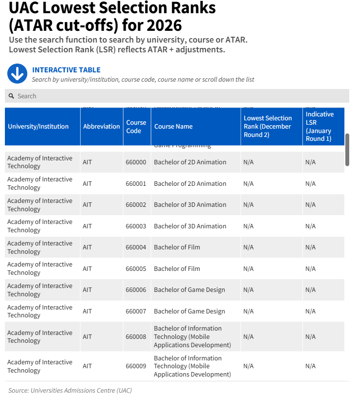 包括格里菲斯大学、Central Queensland University和澳大利亚天主教大学在内的多所高校,已公布各课程ATAR录取分数线,范围从65分及以下到最高分99.95分不等。