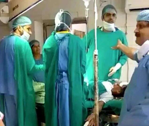 妇产科医生阿肖克·奈尼瓦尔和麻醉师穆拉里·拉尔·塔克,在手术室里做手术的时候,摘下口罩吵架互骂。