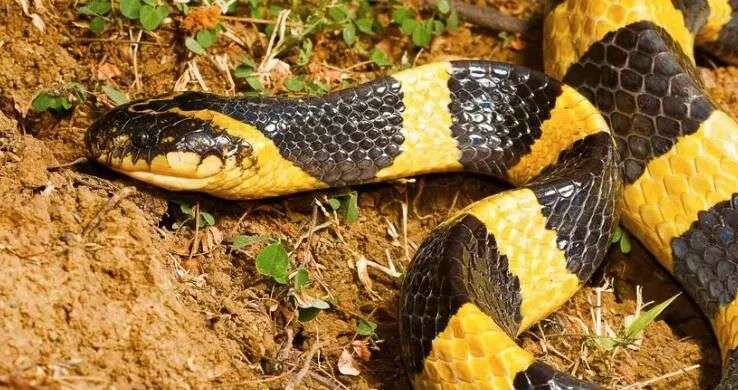 金环蛇是前沟牙类毒蛇,以神经毒为主,毒性十分剧烈,与眼镜蛇、灰鼠蛇合称“三蛇”。