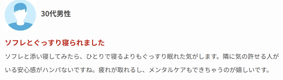 “试着和睡友同床共枕后,感觉比独自入睡更安稳。身边有值得信赖的人带来的安心感简直超乎想象。既能消除疲惫又能进行心理调适,很开心。”