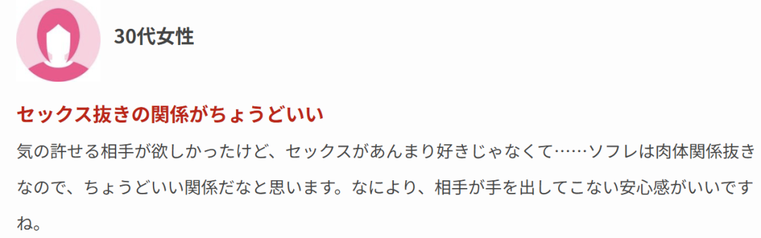 最重要的是,对方不会抱着发生关系的目的对我出手,很有安心感。”