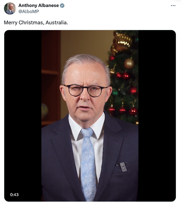 “谨向每一位澳人致以祝愿,愿你们度过一个平安且充满爱意的圣诞节。这是一个让我们携手同行、团结一心的圣诞节,也是一个充满治愈与希望的圣诞节。”