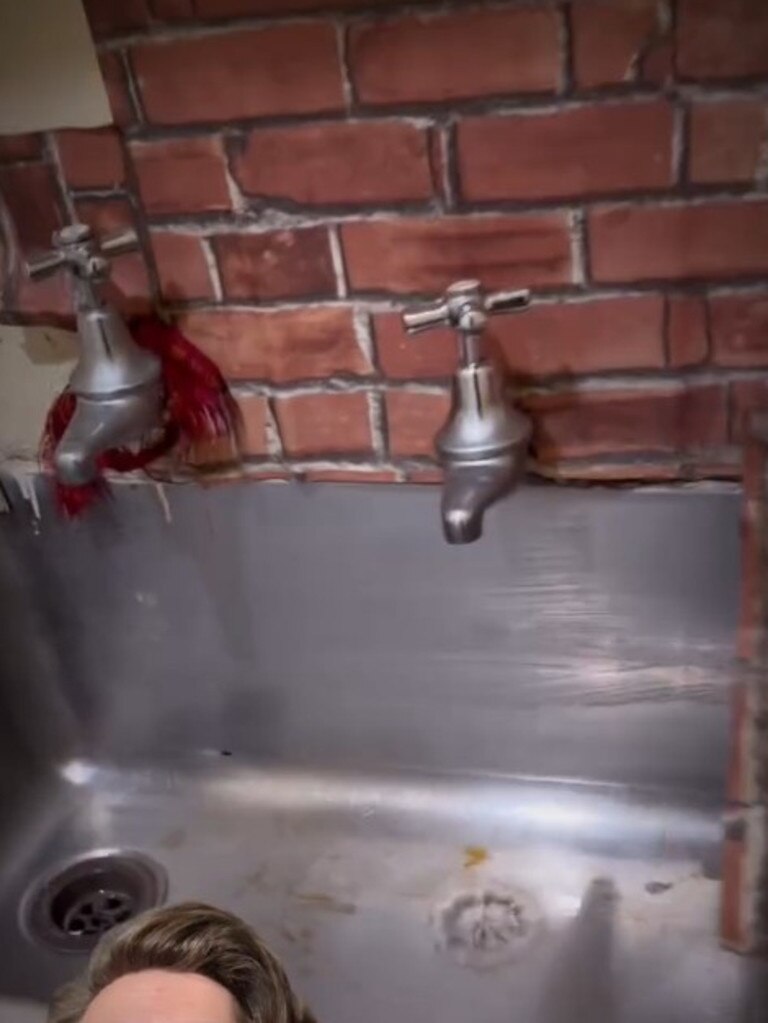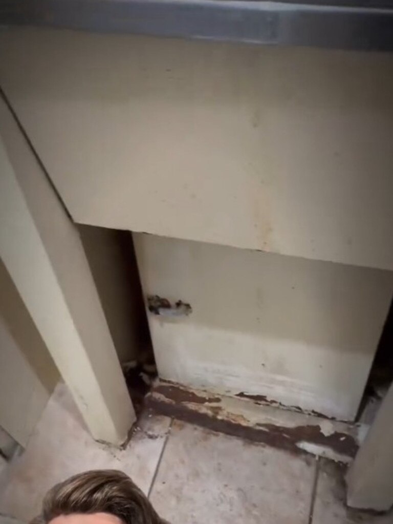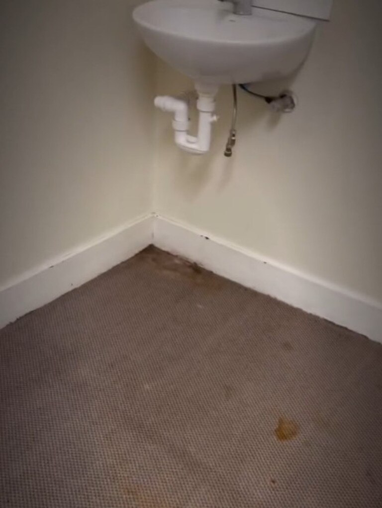 视频显示,卧室布满污渍,浴室墙面有裂缝和缝隙,厨房贴有的砖纹墙纸在水槽周围开始剥落。