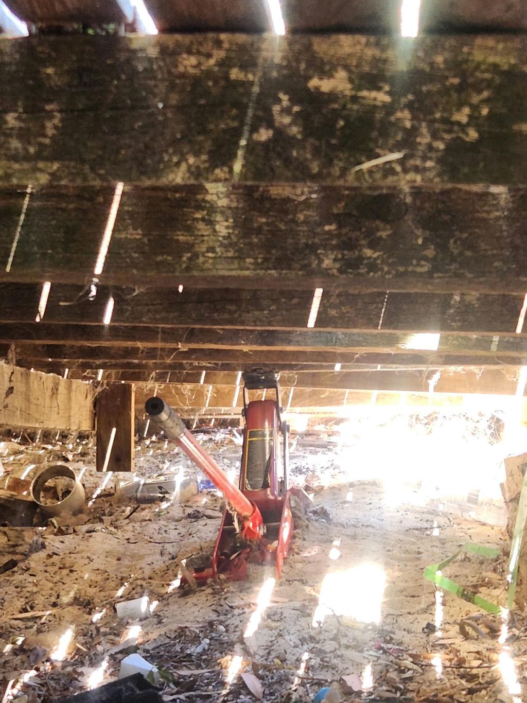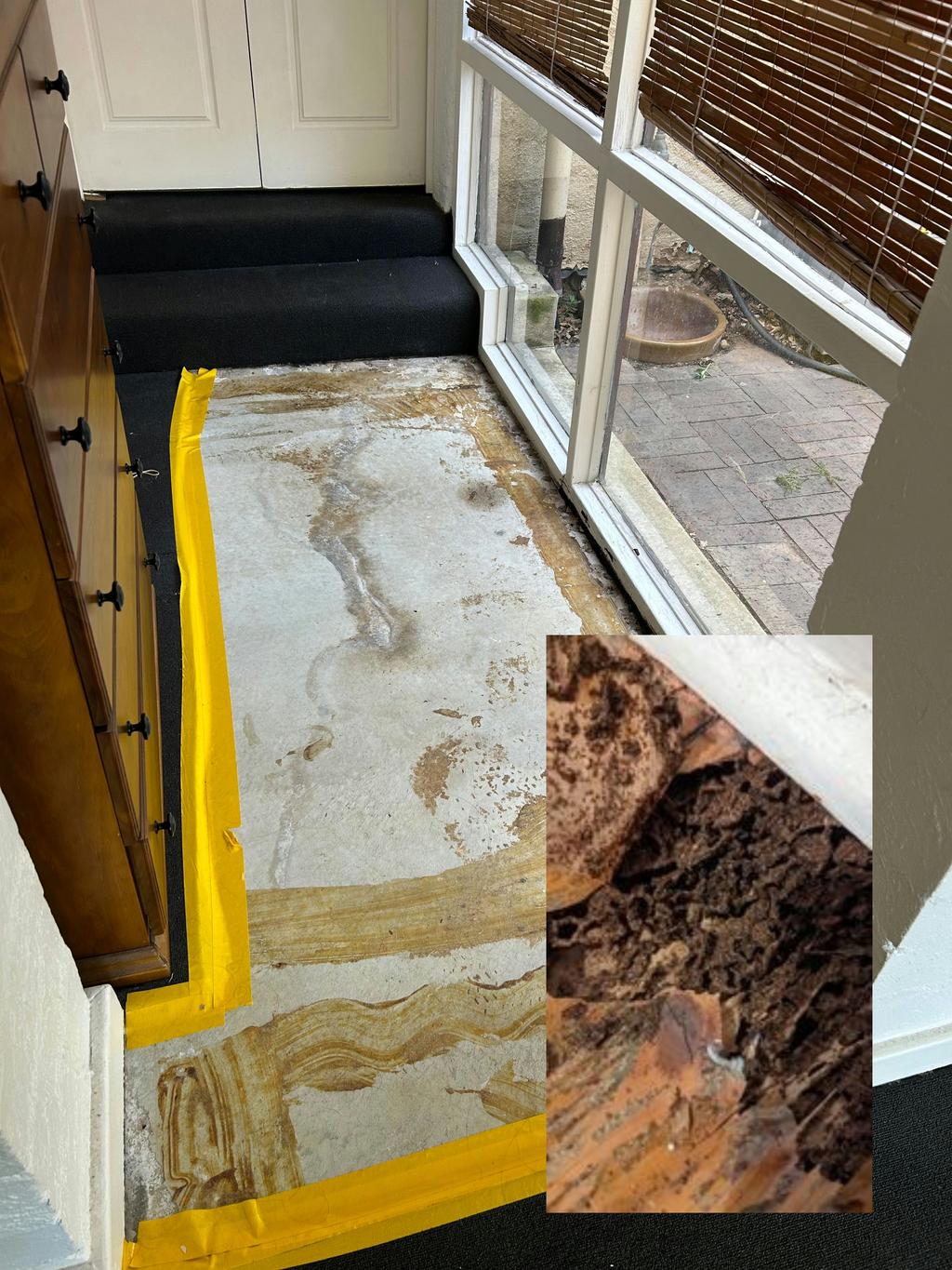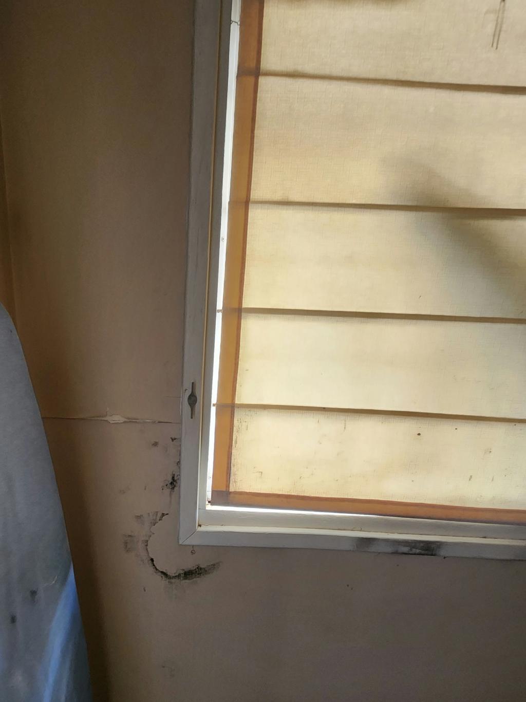 房屋出现白蚁侵蚀,导致地板塌陷,同时屋内漏水,形成黑霉。
