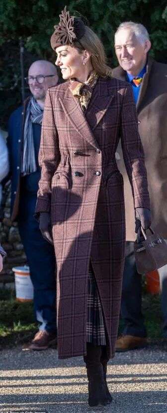 凯特的dress code是“棕色”,她穿了一件棕色粗花呢大衣,搭配同色系的礼帽、丝巾和靴子,身材纤瘦,一头秀发在阳光下闪闪发光。