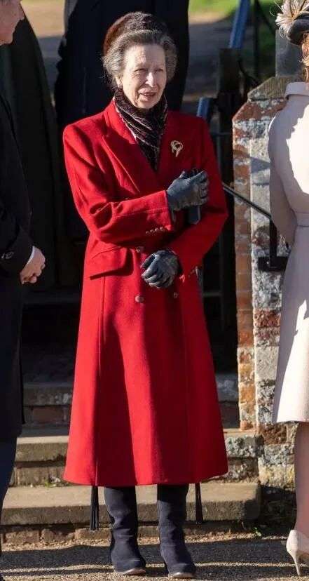 除了亲儿子,查尔斯的手足中也有一些人跟他一起过节,比如安妮长公主,她今年穿了一件大红色大衣。