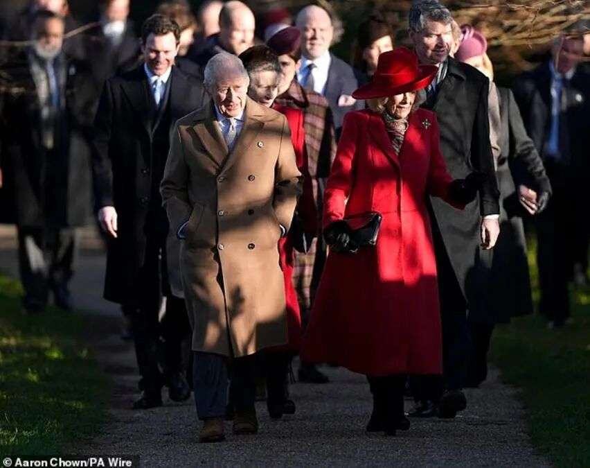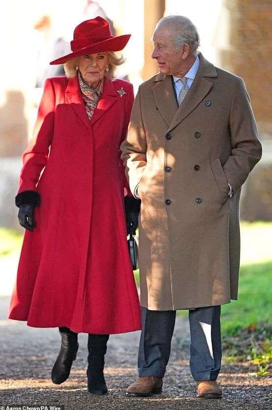 王室集体出动,领头的自然是查尔斯和卡米拉,今年他们穿卡其色双排扣大衣,一个穿了一身红,看样子精神都不错。