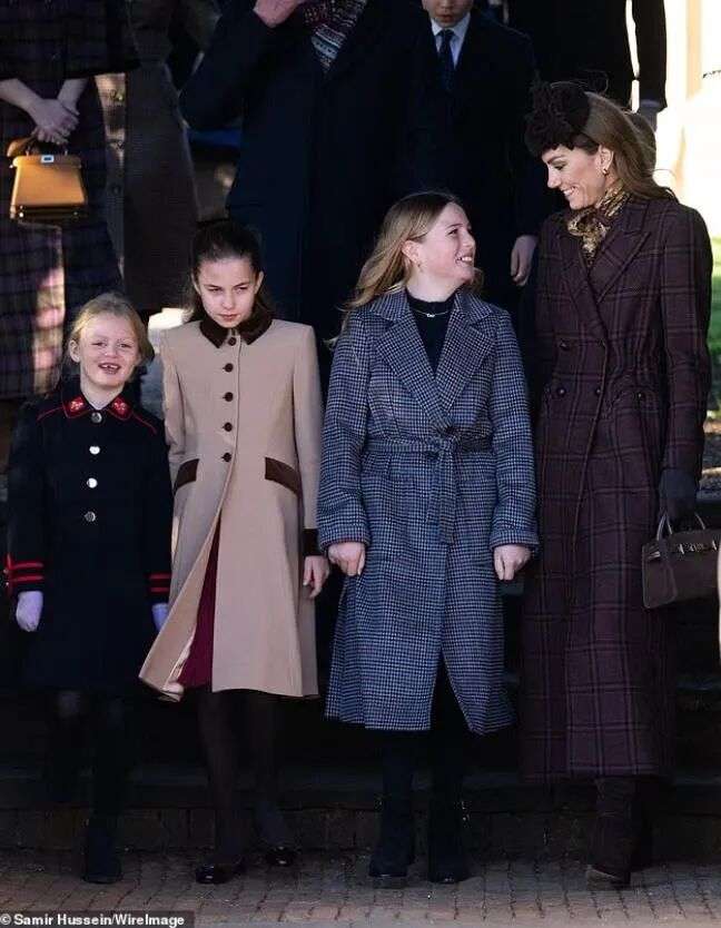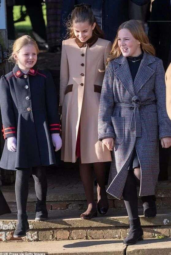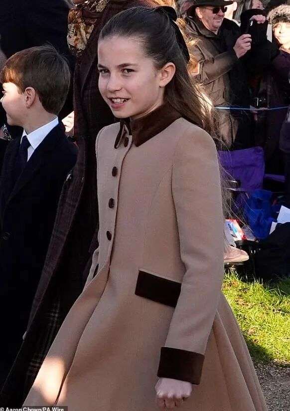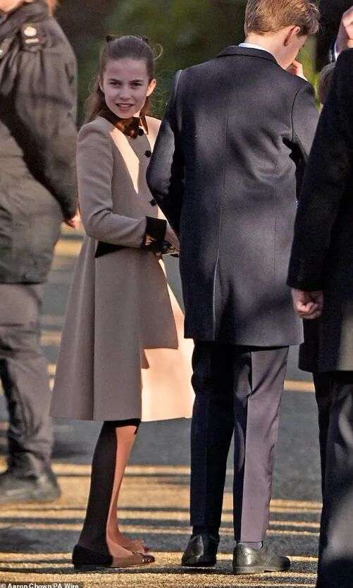 10岁的夏洛特跟妈妈一样,穿了一件卡其色拼接棕色的大衣,她现在长高了,像个小大人,很多人都觉得她长得跟已故的女王越来越像了。