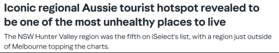 最令人意外的上榜地区是新州的Hunter Valley,总体得分58.73 分,是第五大不健康居住地。