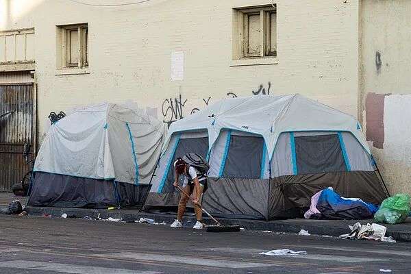 美国加州,洛杉矶市中心的无家可归者帐篷 视觉中国