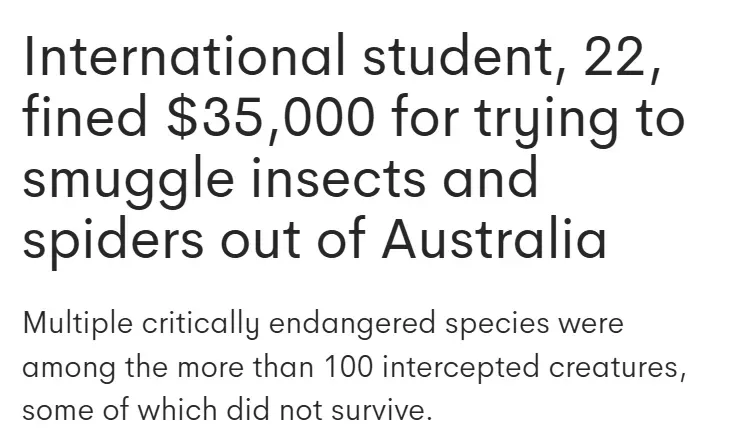 今年11月,澳洲一名22岁的中国留学生Qiran Zhang就因试图将上百只澳洲昆虫和蜘蛛偷运出境,被重罚35,000澳元!
