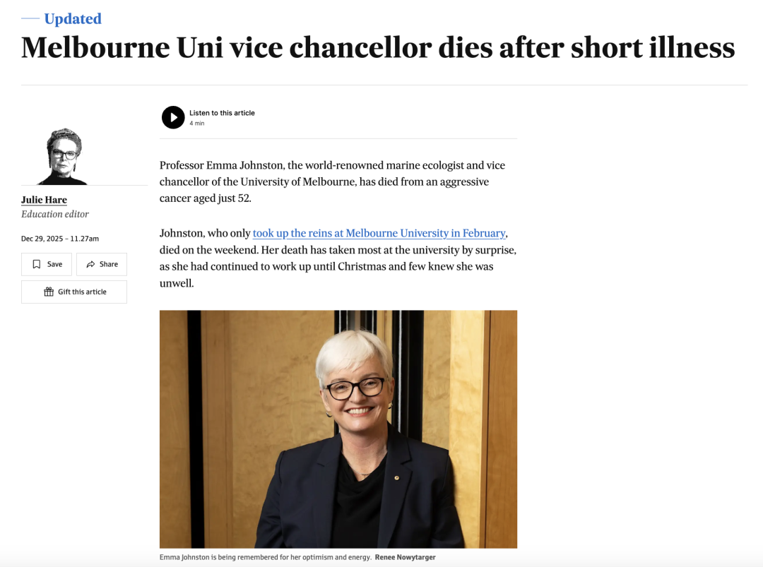 Emma校长于今年2月正式就任墨尔本大学校长,任职时间尚不足一年。她在去世前一直工作至圣诞节前夕。其病情很多人都不知道,因此她的突然离世令校内师生和学界人士深感震惊与哀痛。