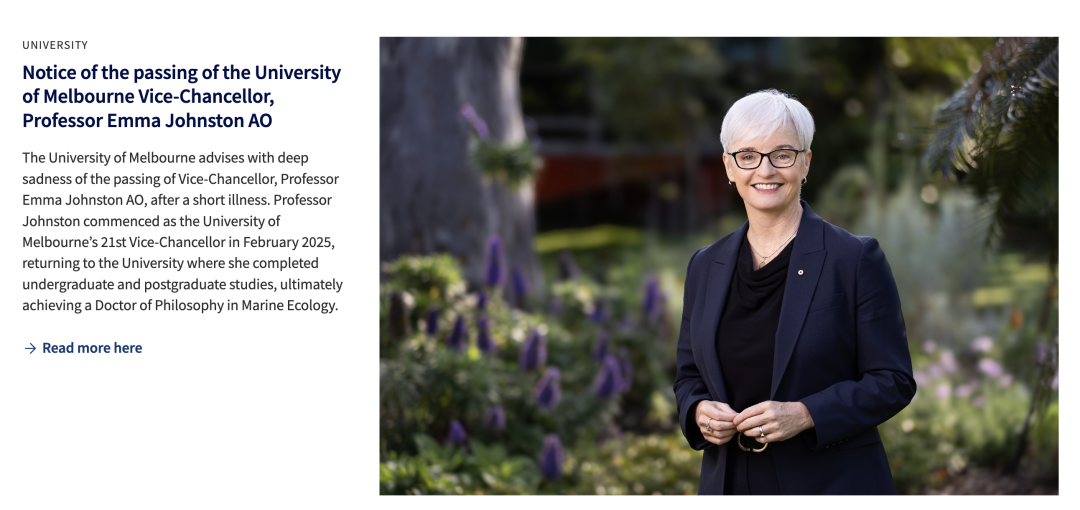 墨尔本大学官网发布:墨尔本大学怀着无比沉痛的心情宣布,校长Emma Johnston教授因病逝世。