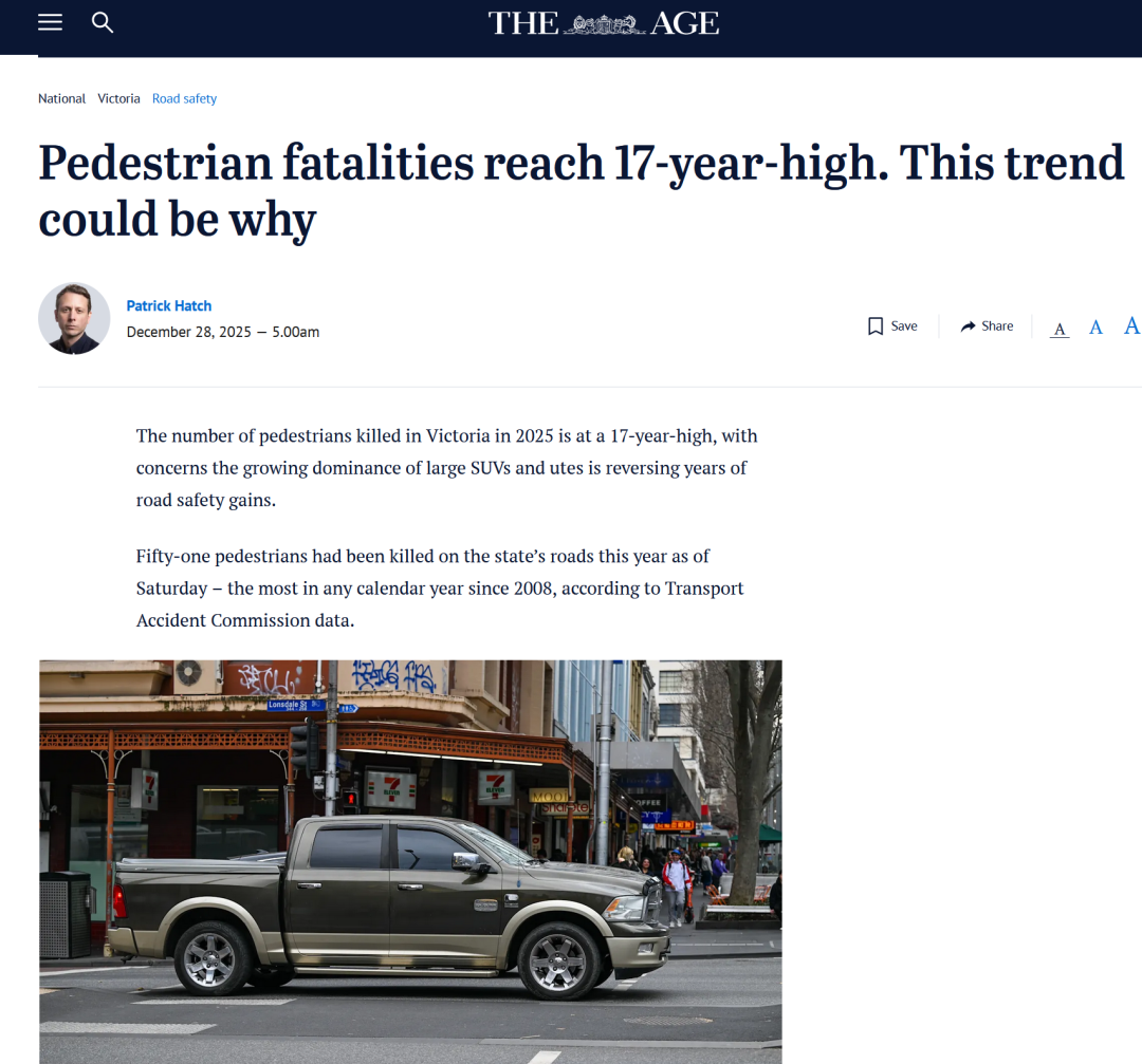 墨尔本大学交通安全研究员Milad Haghani表示,澳洲的趋势和美国类似,近年来SUV车型的流行,更加保护了车上的人,但是导致全国范围的行人死亡增加的原因之一。