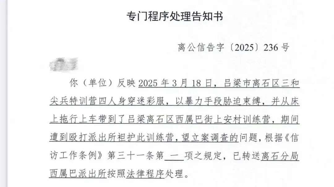 离开特训营后维权期间,刘成收到的专门程序处理告知书/受访者供图