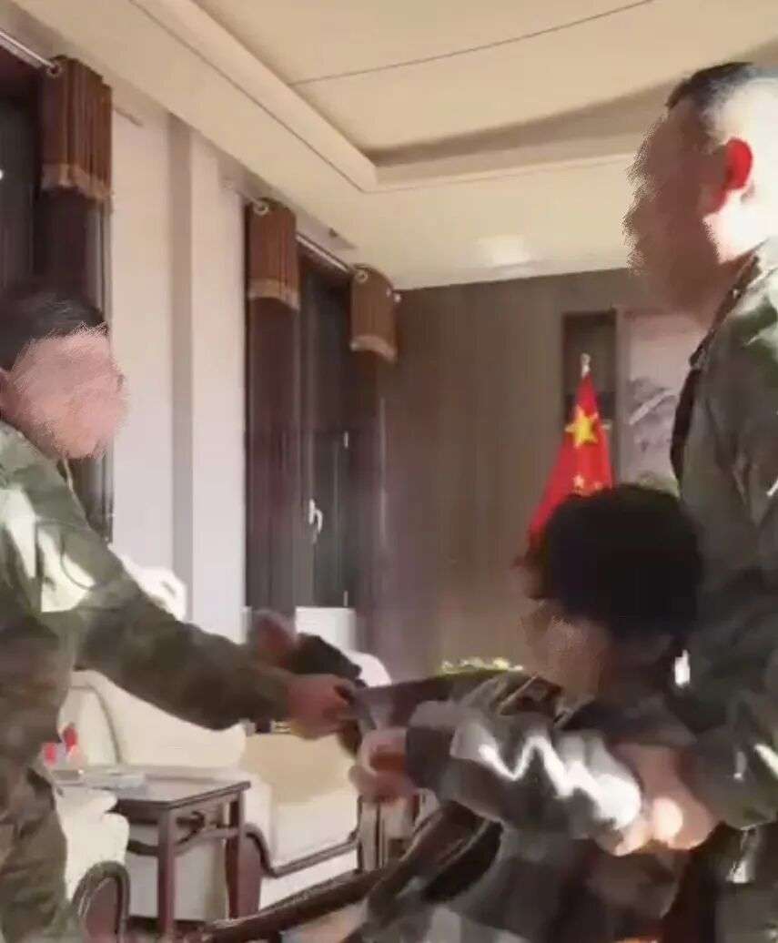 刘成坐在椅子上,要求教官不要录之后被教官们拖走